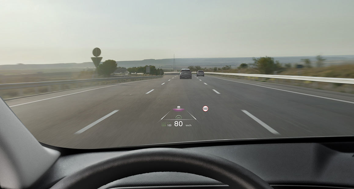Mit dem größeren 25,4 cm (10 Zoll) Head-up-Display behältst du die Straße immer im Blick. Es projiziert die wichtigsten Fahrinformationen dezent auf die Windschutzscheibe, direkt in deine Sichtlinie hinein.⁵